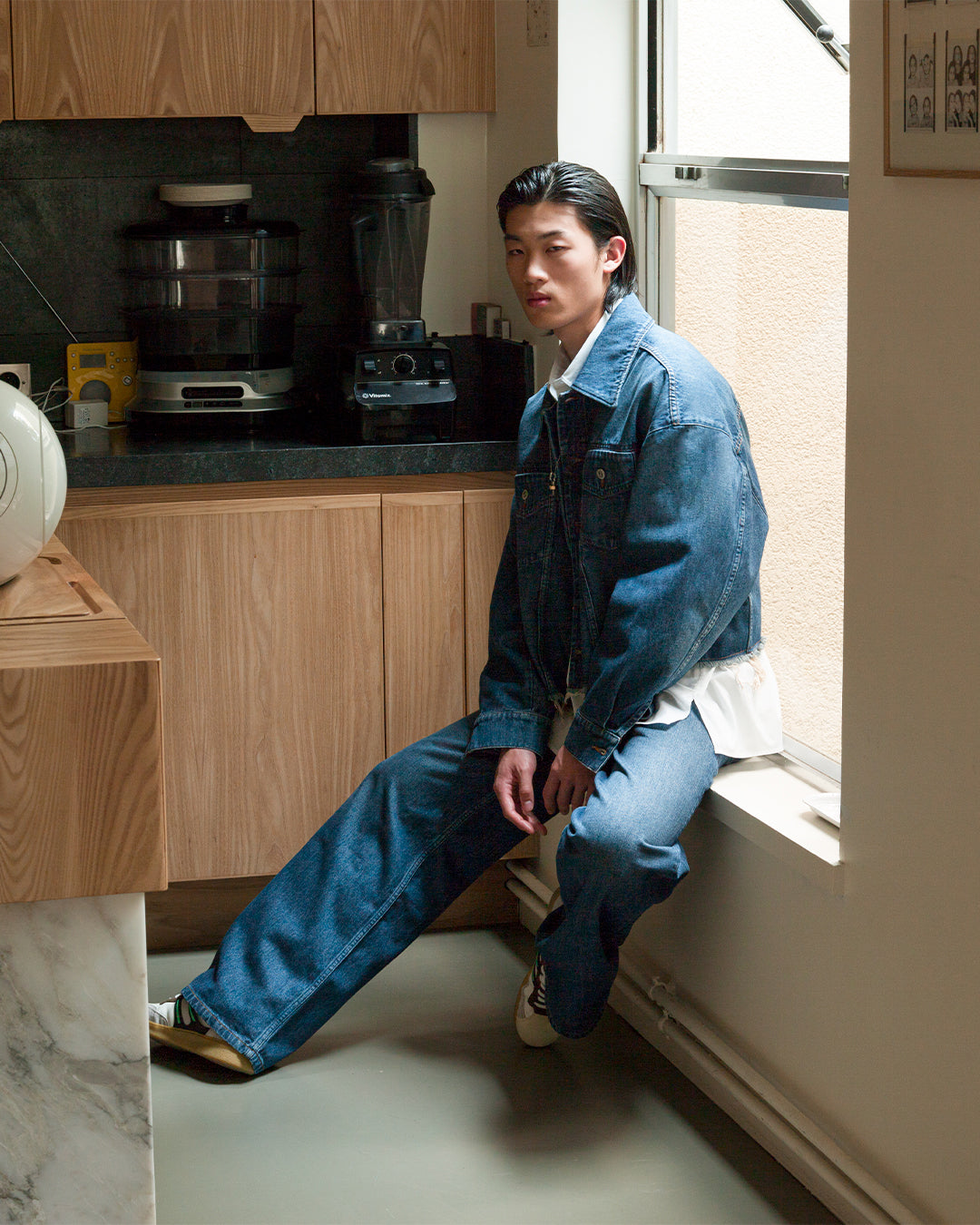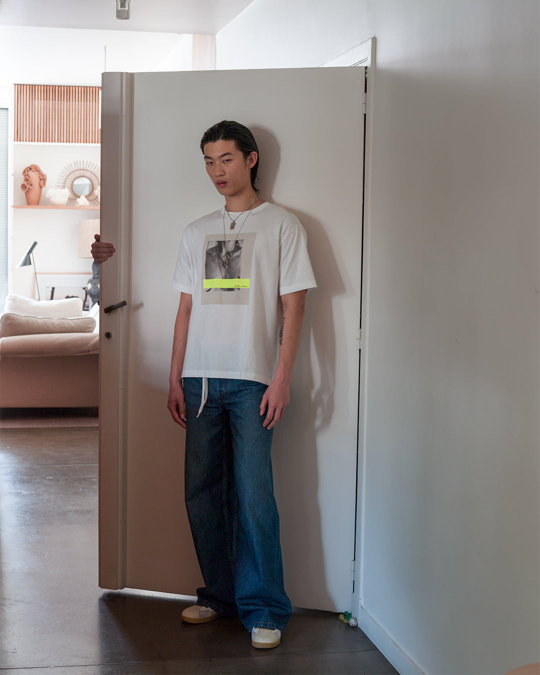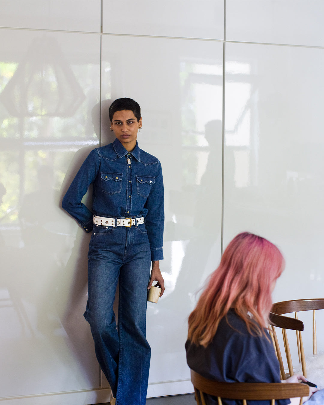 Elle retravaille cet autre fondamental du vestiaire A.P.C. qu’est le jean, avec deux modèles : Clinteau, avec sa taille haute emboîtante, une jambe longue et flare et un détail de pli piqué sur le devant, ou Madame Santeuil, taille mi-haute, jambe large, avec un lien blanc à la taille, évocateur des années 1970.