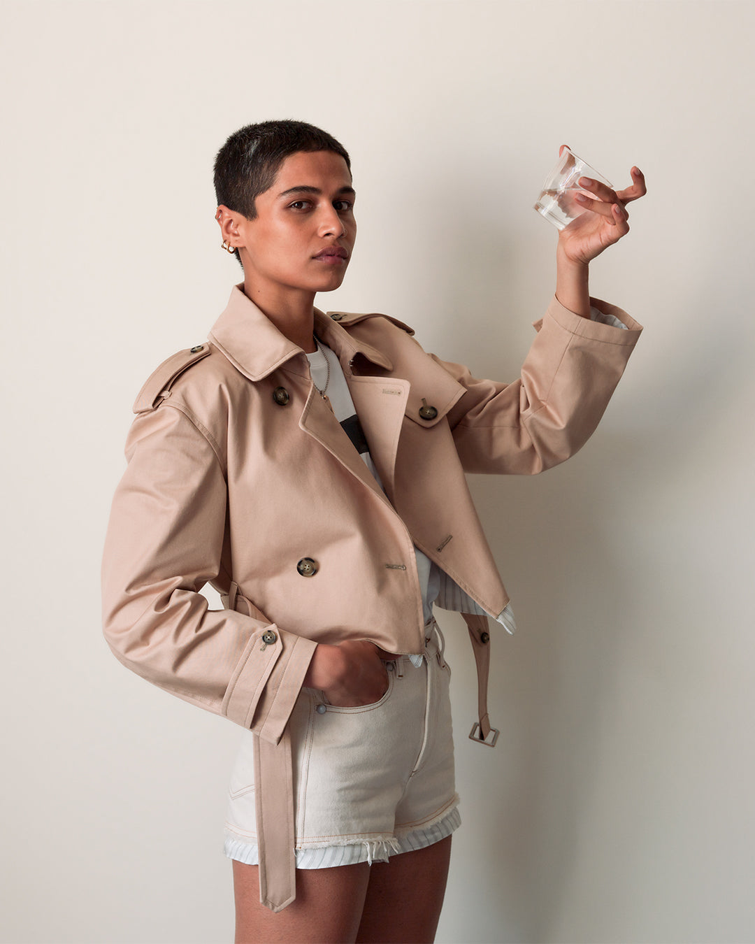 C’est avec cet état d’esprit que Natacha Ramsay-Levi s’est emparée des matières et des pièces emblématiques du vestiaire A.P.C.: denim, popeline, gabardine de coton, qu’elle twiste à sa façon, repensant les proportions, à l’instar du trench en gabardine qu’elle réinvente en version cropped ultra seyante ou en version plus longue et zippée. Certaines pièces sont également disponibles pour hommes, à l’instar de la chemise western en denim léger bio.