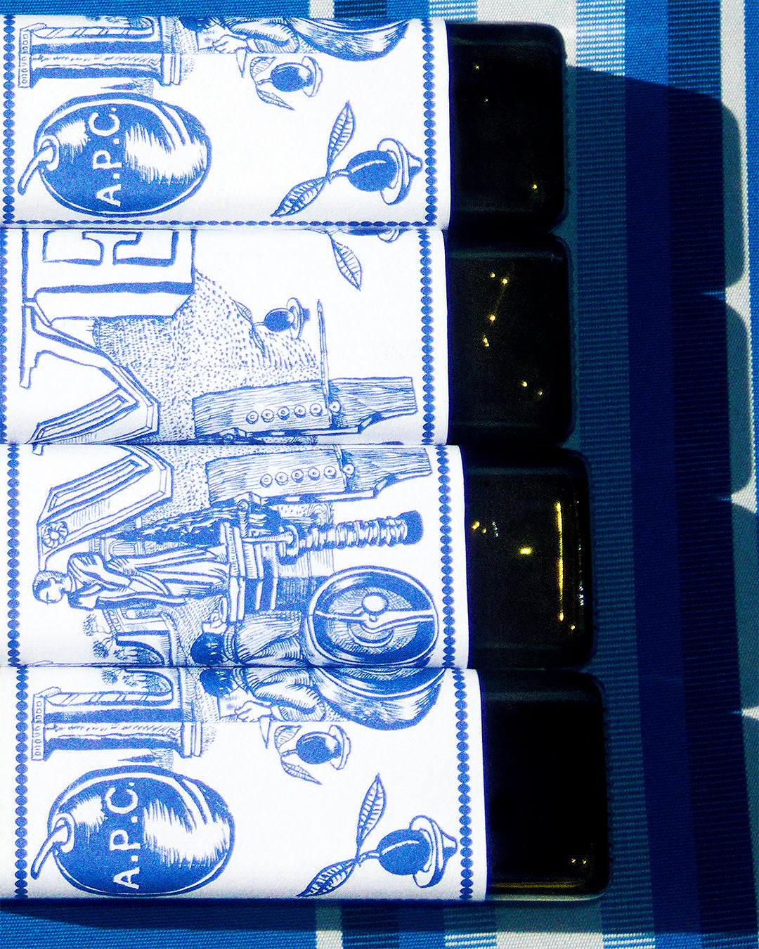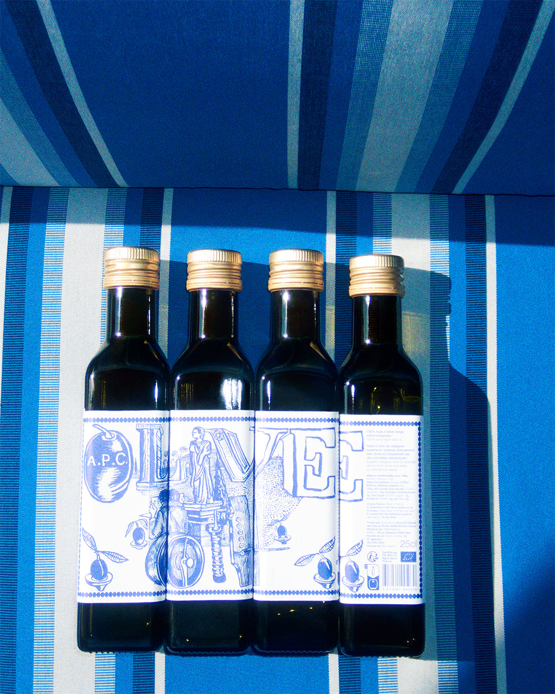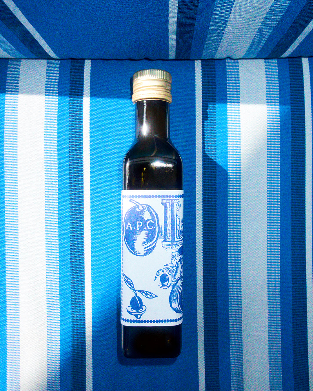 A.P.C. propose, pour la deuxième année, une huile d’olive produite en exclusivité pour la marque par le moulin des Ombres du Château de Montfrin, dans le Gard. Il s’agit d’une huile certifiée bio, très verte, assez douce, peu marquée en ardence et amertume, issue d’oliviers d’origine toscane. Une huile rare, pressée grâce à la technologie la plus récente permettant de conserver l’intégrité du pur jus de fruits qu’est l’huile d’olive.