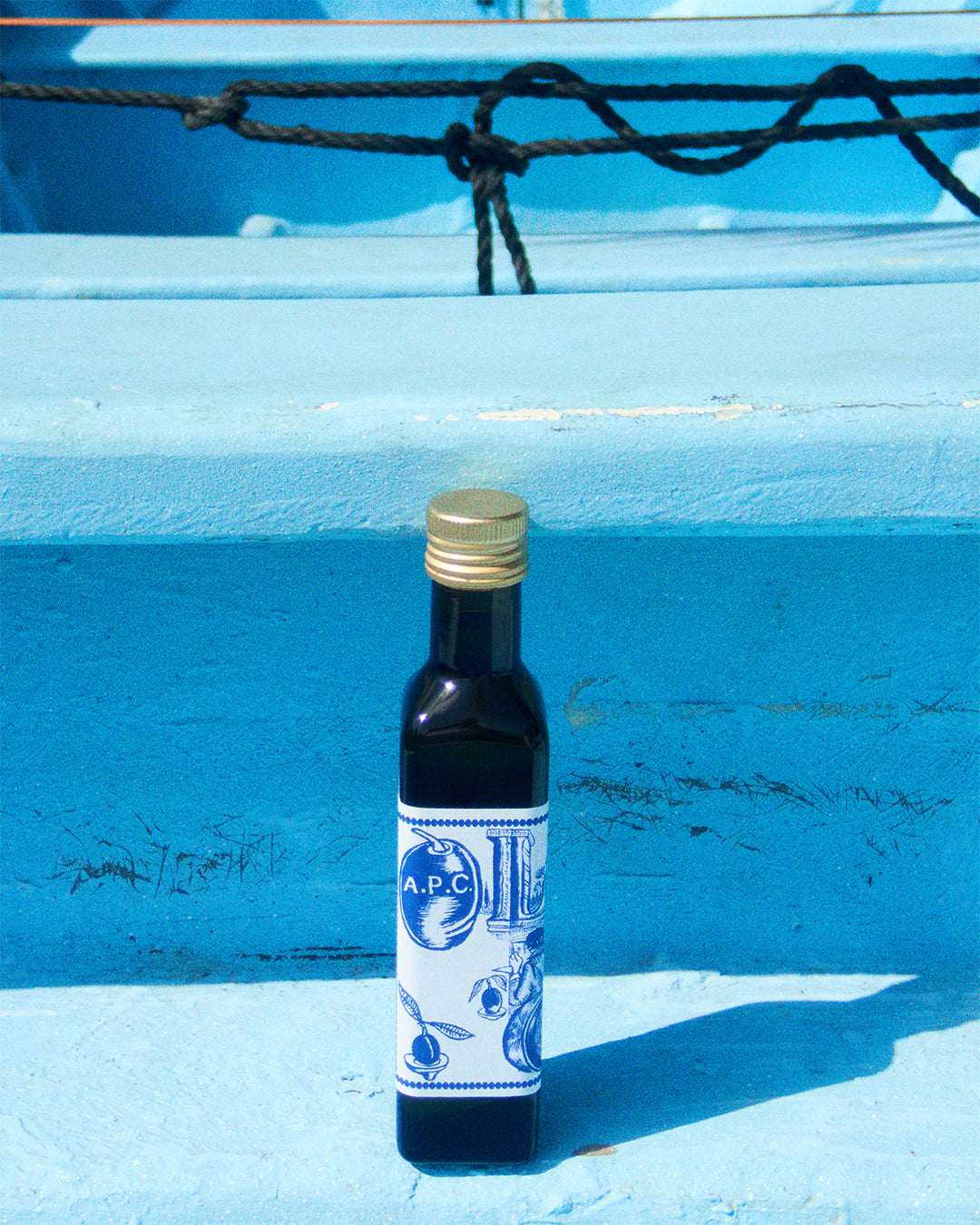 « Avec sa personnalité assez forte, elle est parfaite pour accompagner des mets aux saveurs plutôt simples. Essayez-là sur un poisson comme le cabillaud, ou même sur du riz, une pomme vapeur ou des pois chiche ! », conseille Jean Touitou. L’huile d’olive A.P.C. est vendue en bouteille de verre de 250 ml, ornée d’une étiquette originale conçue par Mathias Augustyniak, du studio graphique M/M. Pour cette deuxième saison, elle est imprimée sur fond bleu. Huile d’olive vierge extra A.P.C., bouteille verre 250ml, 15€.