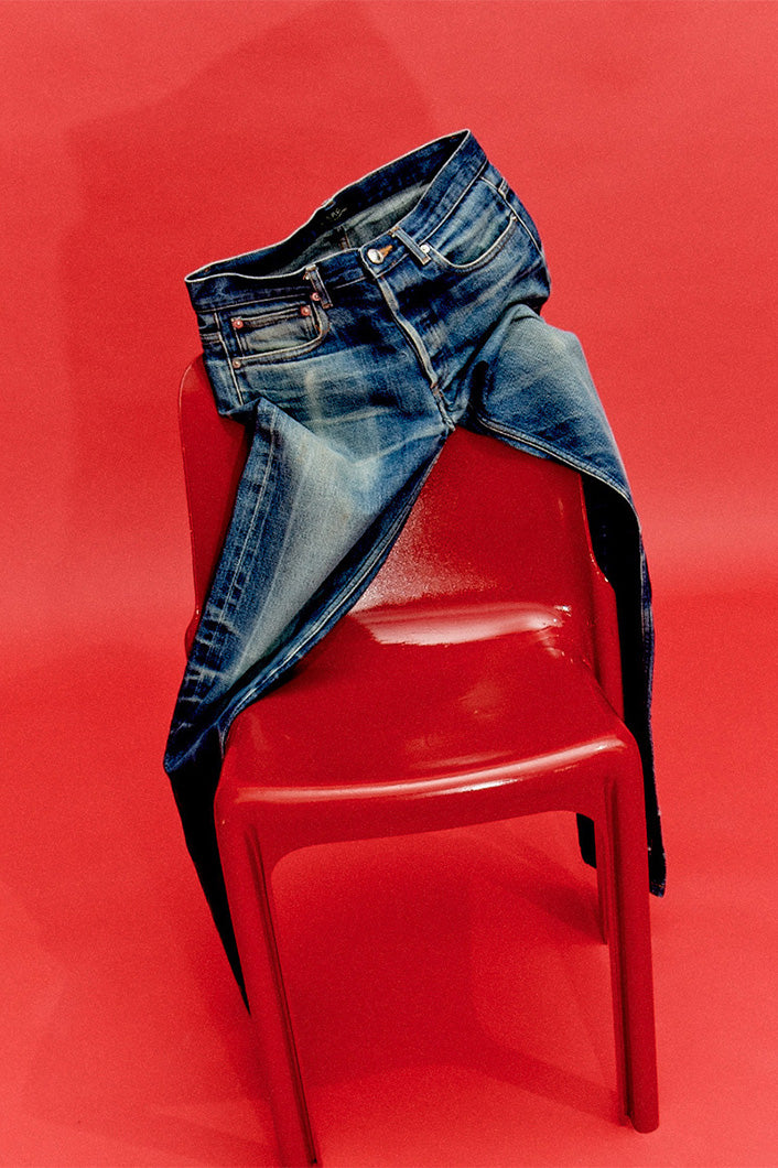 Plus que de recyclage, il s’agit d’une transmission : on ne rapporte pas simplement un jean usé. Chaque pièce est soigneusement marquée des initiales de son ancien propriétaire, puis lavée, raccommodée si besoin, et repassée avant de recommencer sa vie en tant que Butler. Ces jeans, avec leur patine unique, racontent chacun leur propre histoire, une vie antérieure dont ils portent les stigmates.