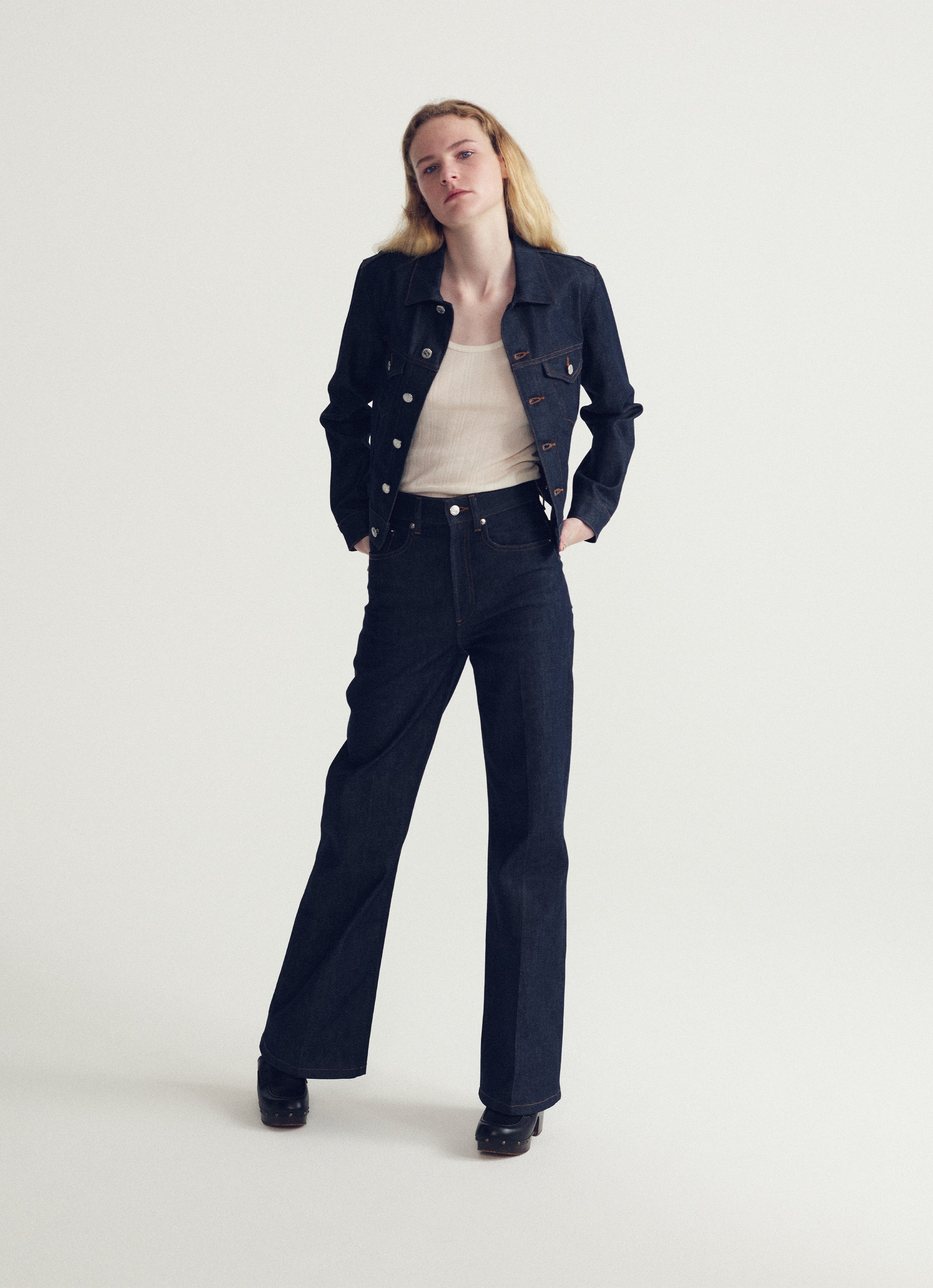 Jean en denim japonais indigo en coton bio et à jambe large esprit 70's.