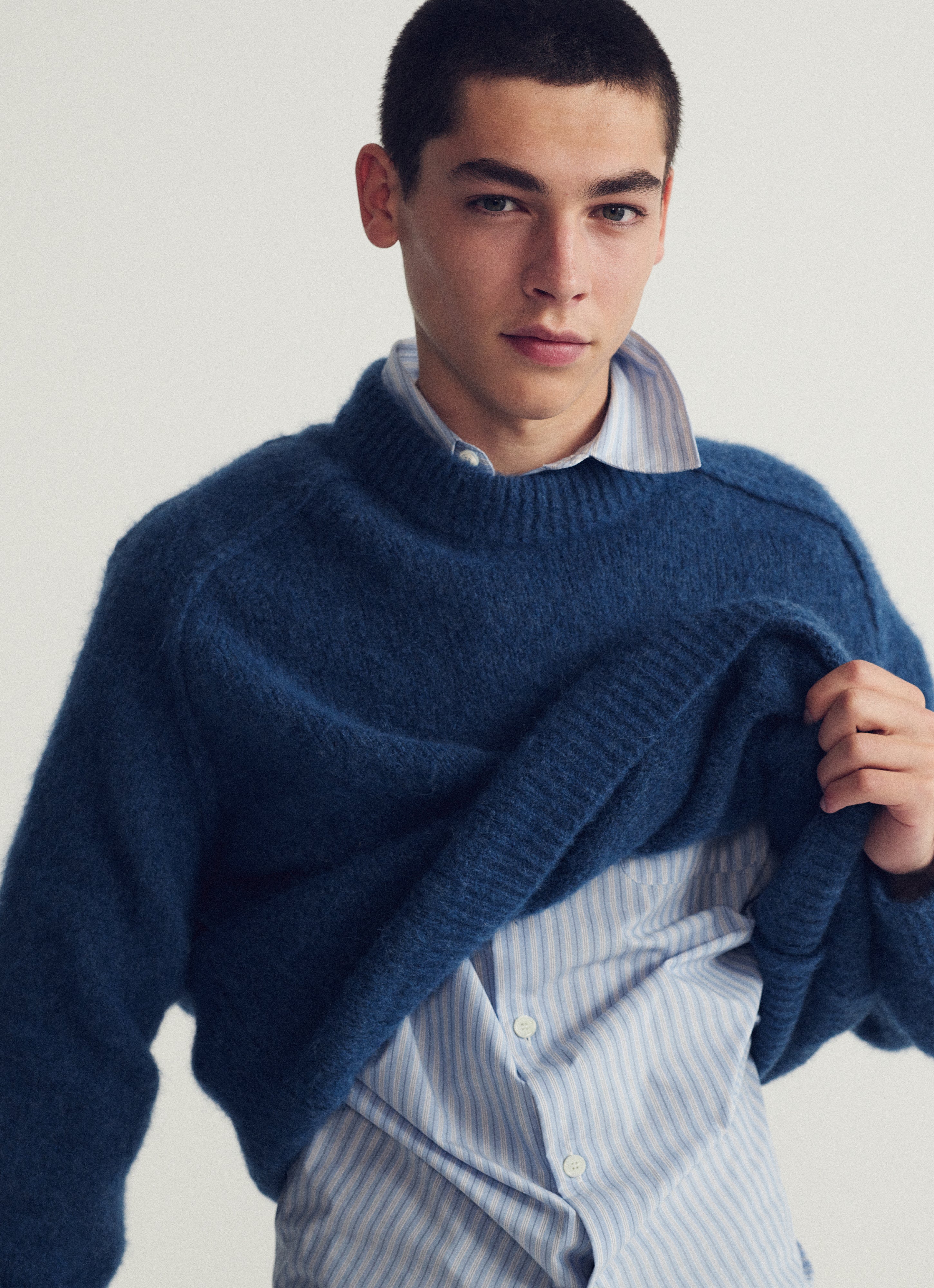 Pull ample bleu acier en mélange alpaga et mérinos.