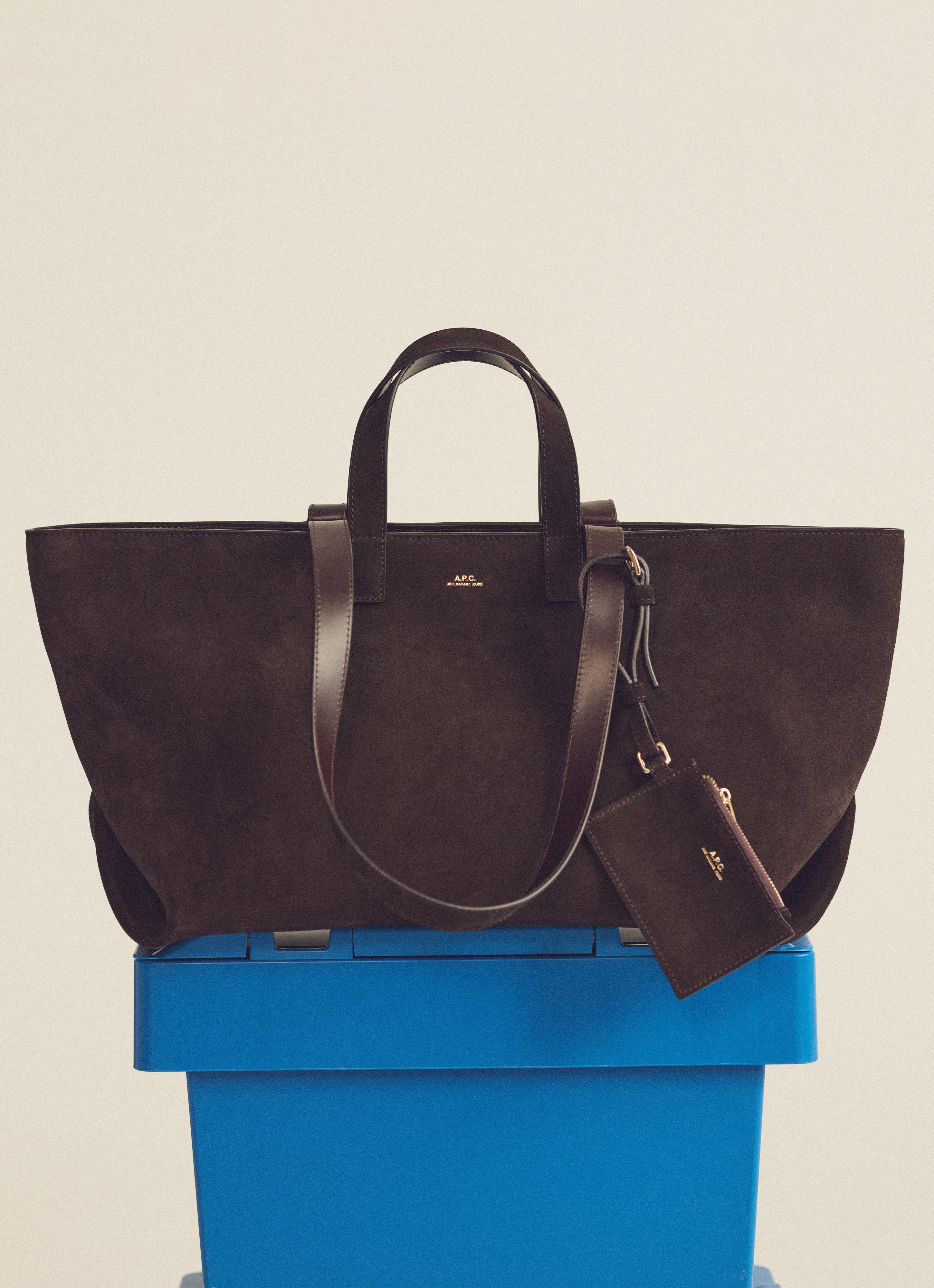 Large trapezoidal bag in smooth tonka brown leather and suede.
